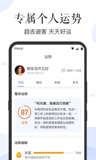 2.隐私保护政策:明确承诺不收集用户非必要敏感信息(如通讯录、地理位置,除非用户主动开启相关功能用于精准推荐),仅获取必要权限(存储权限用于保存收藏内容、网络权限用于更新黄历数据),且用户数据默认仅用于个人使用,不用于其他商业用途。