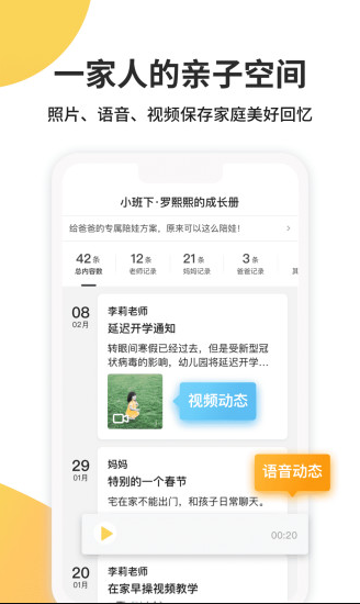 3.高清适配:支持全面屏、折叠屏设备,成长记录照片/视频显示清晰(无模糊/拉伸),视频课程与互动内容自动适配屏幕尺寸,提供优质的视觉体验。
