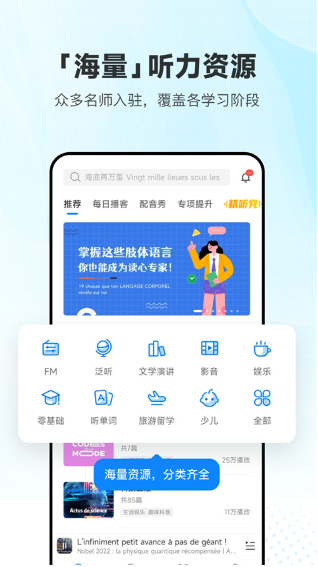 2.训练科学高效:分级分类+智能推荐+互动学习,助力用户针对性提升听力能力,形成科学学习路径。