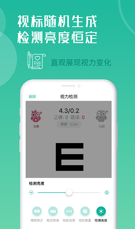 1.个性检测:检测过程严格参照国家标准,支持自由设置视力表测试模式,用户可随心调节检查距离、视标大小、视标数量、屏幕亮度等参数,在确保检测准确性的同时提供个性化配置