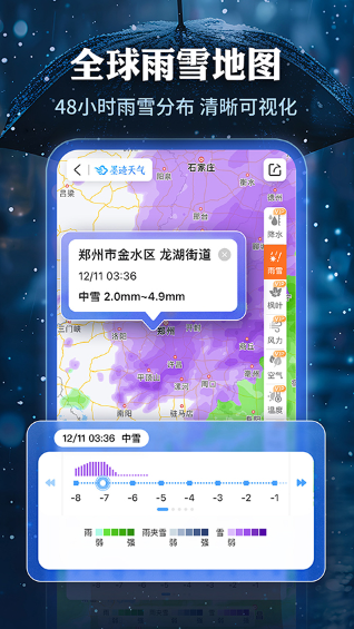 短时预报:分钟级、公里级精准预报,助力完美应对雨雪、大风等突发天气状况;
